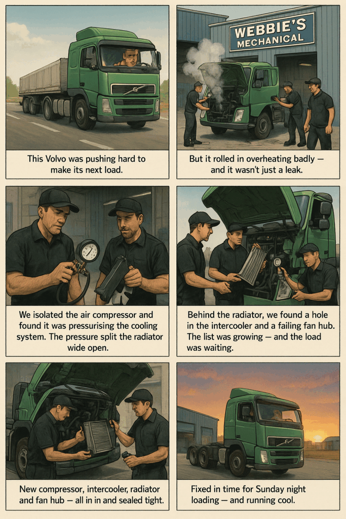 At first glance, it looked like a cooling system fault. But once our team got into it, we found something more serious: the air compressor was pressurising the coolant system, and it had built up so much force that it actually split the radiator open.