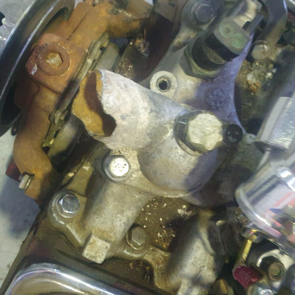Once it arrived at our workshop, the cause became clear. The previous owner had been running straight water, and over time it had corroded the thermostat housing. The corrosion was so bad that the hose fitting had actually broken the aluminium.