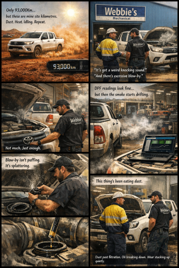 Only 93,000km on the clock… but the kind of kilometres that hit different. Mine site kilometres. Dust, heat, idling, stop-start, repeat.